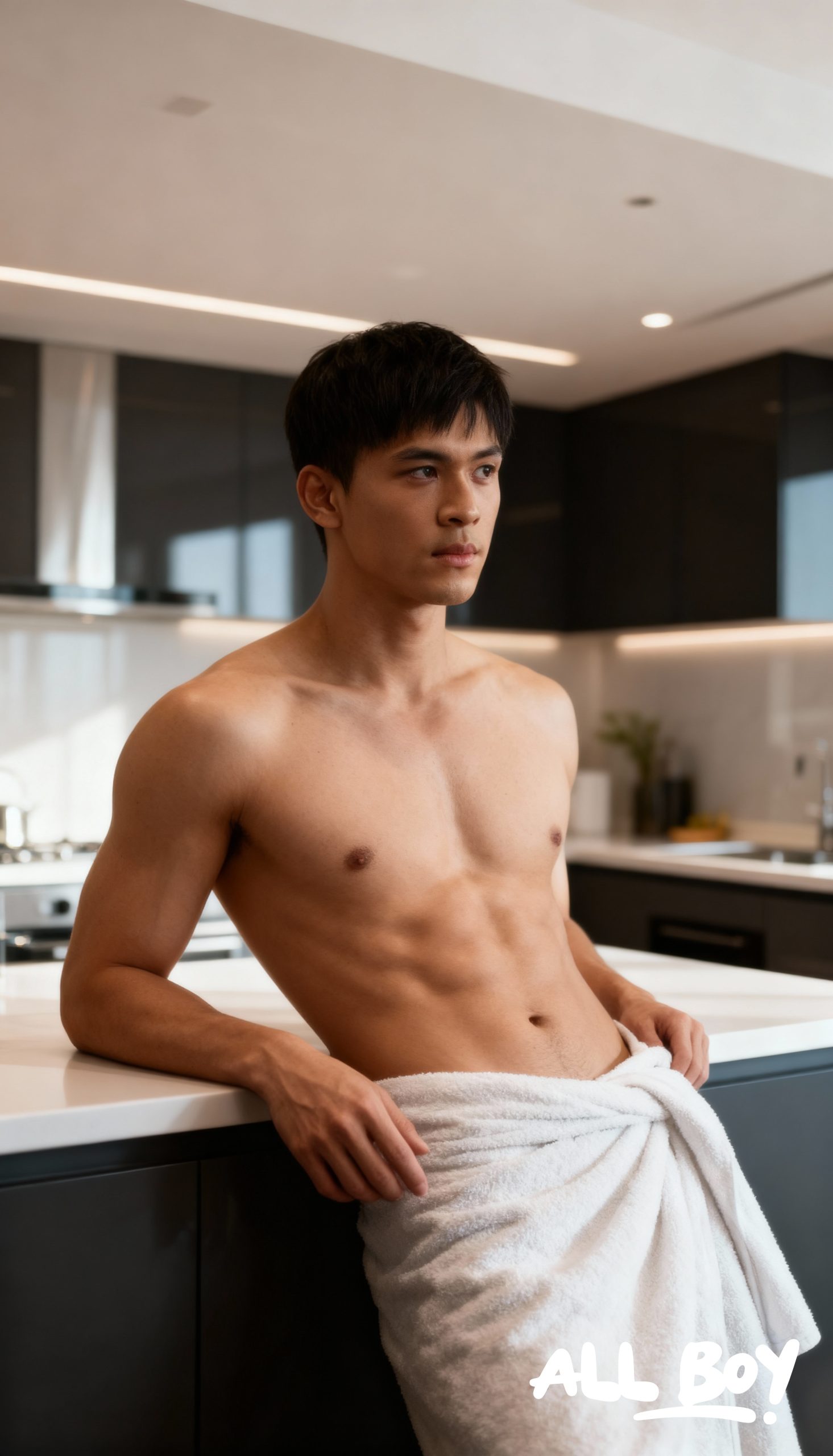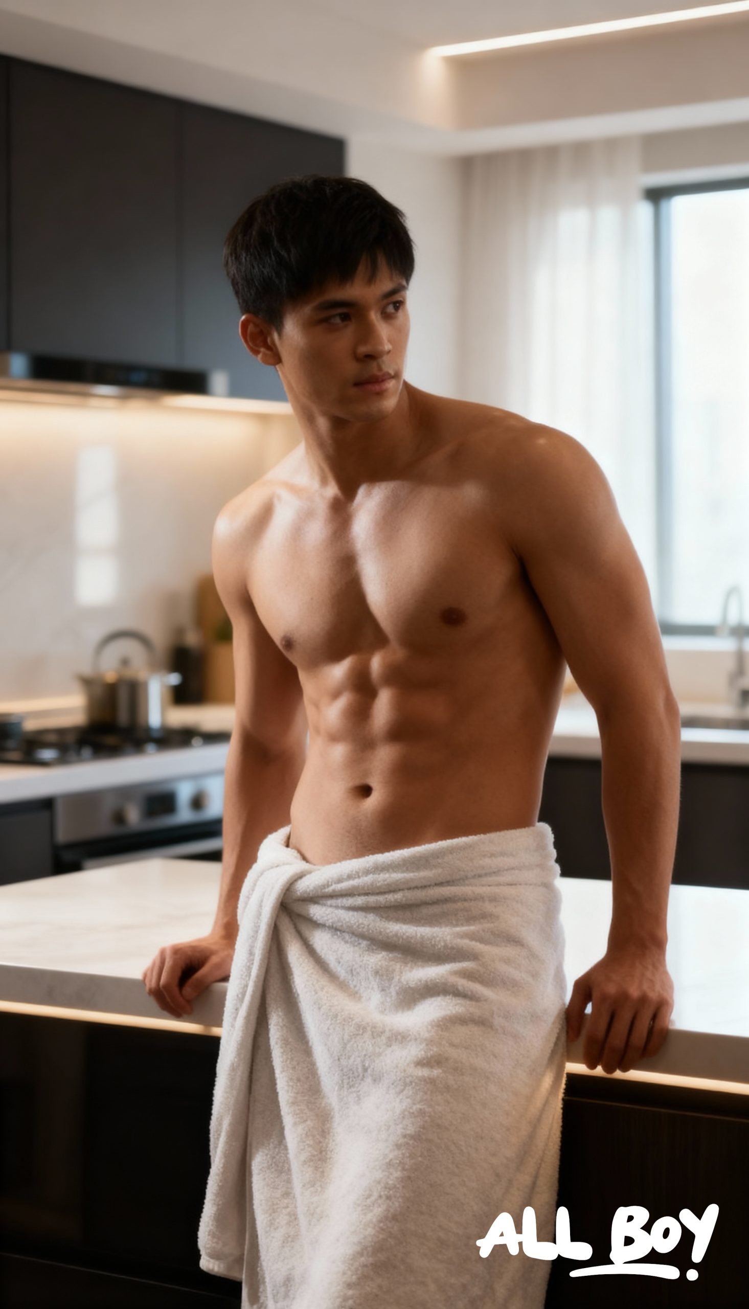 Now that’s a perfect way to start the day! Just casually leaning against the counter in a modern kitchen, bathed in that beautiful morning sunlight… it’s a whole mood. The lighting highlights his incredible physique, and he just looks so effortlessly handsome and relaxed. You can’t help but wonder what he’s thinking about. Coffee first, or breakfast?