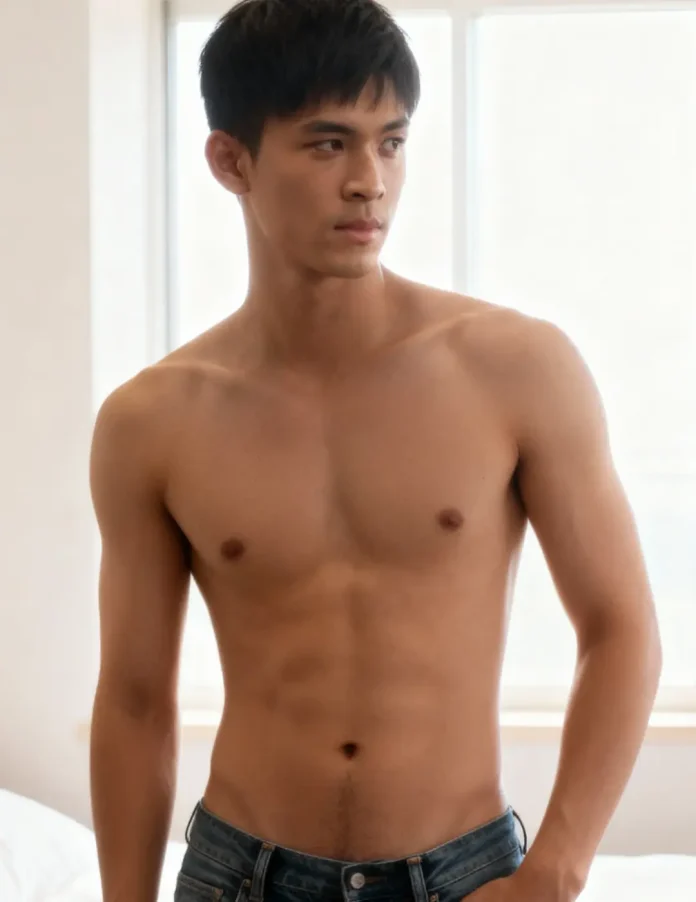 There’s something so captivating about this quiet moment. The soft morning light streaming through the window, the simple background… it’s all so calm and peaceful. And let’s be real, he looks absolutely amazing. That thoughtful expression and relaxed pose create such a natural, handsome look. It’s the kind of picture that makes you want to cancel all your plans and just enjoy a slow, lazy day at home.