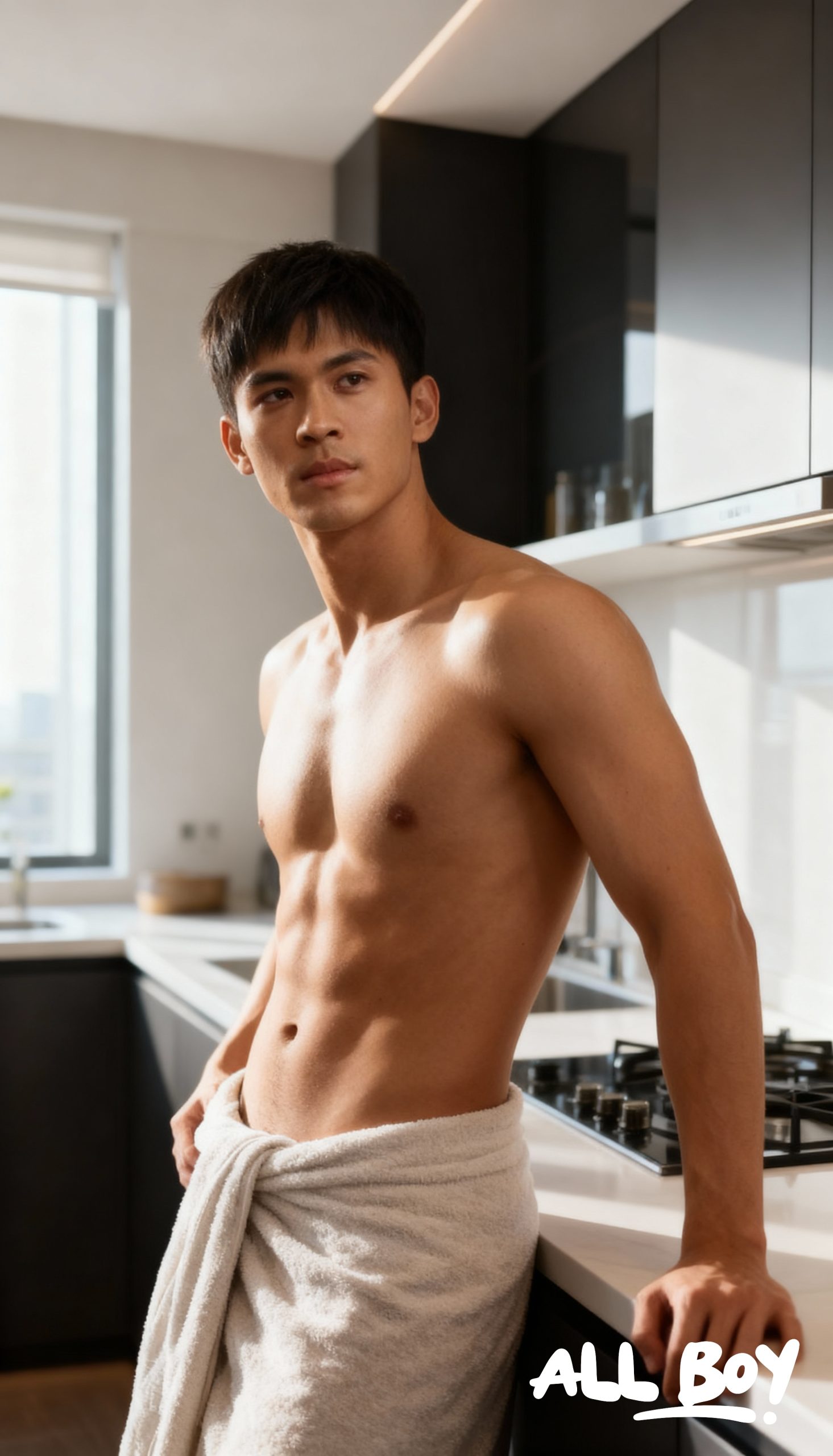 Now that’s a perfect way to start the day! Just casually leaning against the counter in a modern kitchen, bathed in that beautiful morning sunlight… it’s a whole mood. The lighting highlights his incredible physique, and he just looks so effortlessly handsome and relaxed. You can’t help but wonder what he’s thinking about. Coffee first, or breakfast?